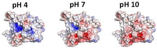 According to experimental results obtained, the effect of the pH on the BCL immobilization showed that lower pHs (acidic environment) increase the enzyme adsorption capacity. On the other hand, at higher pHs (>7) the enzyme adsorption decreases, reaching the lowest value at pH 10. Thus, to obtain information about the BCL charge at various pHs, the enzyme protonation states were calculated. Figure 4 shows the charge distribution along the structure of the BCL, composed of a sequence of 320 amino acids, at pH 4, 7, and 10. At pH 4, below the isoelectric point of the enzyme, the identification of a quantity of 42 positively charged amino acids (Table S2), corresponds to the blue areas in Figure 4. With the increase in the pH, it is possible to identify the variation in the amounts of charges distributed in the structure, and at pH 7 (slightly above the isoelectric point) there is a decay of the total value of the positive charges to 32, causing a decrease in the blue surface of Figure 4. For the pH 10 range, it is possible to notice that the enzyme surface presents mainly negative charges (red areas), totaling 29 positive charges only.