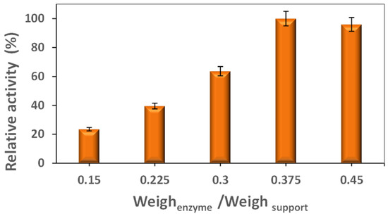 To determine the best enzyme/support concentration, the results obtained were calculated according to the relative activity. Figure 5 shows that the maximum relative hydrolytic activity of the BCL immobilized by the physical adsorption was obtained with 0.375 genzyme/gsupport with about a 36% immobilization yield and 457 U/g hydrolytic activity; the others are displayed in the Supplementary Materials (Table S3). The profile obtained may be due to the saturation of the support with the lipase, showing a decrease in activity above 0.375 genzyme/gsupport. This decrease in relative activity can be attributed to the formation of a multilayer protein structure blocking or inhibiting access to the enzyme’s active sites [28]. Therefore, the concentration of 0.375 g was selected for the following stages of this work. Enzymatic adsorption on the graphene oxide occurs through weak bonds, such as van der Waals forces, ionic interactions, or hydrophobic interactions [29].