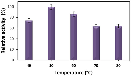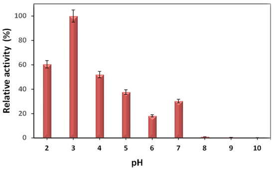 Figure 6 shows the effect of the pH on the lipase activity of the immobilized BCL. The optimum pH for the free lipase from Burkholderia cepacia is 7.0 [27]. It can be noted that for the immobilized BCL, the ideal pH was changed to a more acidic pH of 3.0 (462 U/g). Other pHs are provided in the Supplementary Materials (Table S4). Changes in the ideal pH for the immobilized enzymes have been reported for the different sources of lipase and types of transporters [29]. A study by Carvalho et al. [27] on Burkholderia cepacia lipase immobilized on xerogel silica showed a change in the pH optimum to 3.0, whereas the pH optimum of the free lipase was 7.0. This alteration was due to the properties of the support and the method of immobilization.