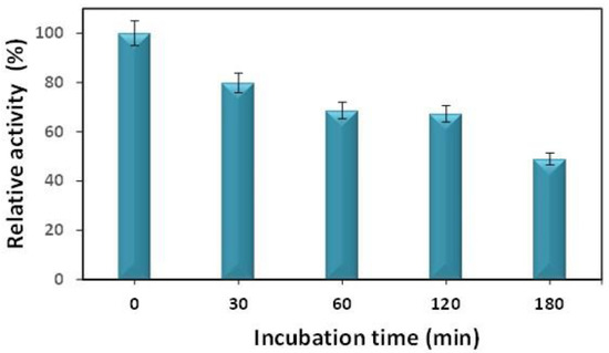The thermal stability of the immobilized biocatalyst was investigated by incubating them at 50 ℃ in different time durations (30 to 180 min), and the evaluation of their residual activities is shown in Figure 8. The residual activity of the immobilized biocatalyst, which was incubated at 50 °C for 0 min, was considered as the control with 100% activity; the other values are displayed in the Supplementary Materials (Table S6). As shown in Figure 7, the residual activity of the immobilized biocatalyst was decreased by increasing the incubation time, and it maintained its residual activity above 50% after 120 min of incubation time.