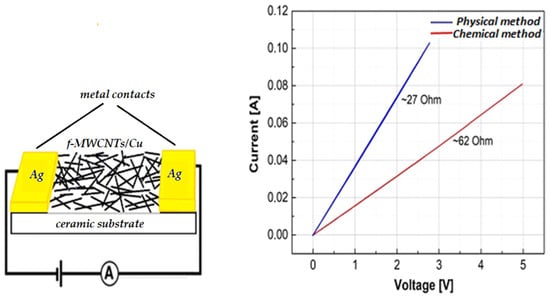 - Chemical method—electrochemical deposition: 4 g of CuSO4 salt was dissolved in 16 mL of distilled water and added to electrolyte. A graphite or copper electrode was used for the cathode, and a structure consisting of a network of closely spaced MWCNTs on the substrate was used for the anode. When the required voltage was applied to the electrodes, the current generated between the electrodes carried the Cu2+ ions onto the MWCNTs. This process resulted in the deposition of Cu atoms on MWCNTs. The process was repeated a number of different times and the optimal condition was chosen for the deposition of a very thin metal layer.