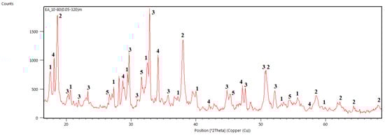 Main identified phases detected in steel slag sample: (1) Calcium Aluminum Silicate Hydroxide; (2) Magnesium Hydroxide; (3) Calcium Silicate; (4) Calcium Hydroxide; (5) Calcium Silicate Hydroxide Hydrate.