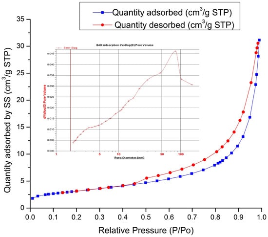 Table 4 represents the characteristics of the SS surface by the BET method. The studied steel slag was characterized by a surface area of 10.90 m2/g, representing a great surface area compared with other SS studies. Furthermore, the SS demonstrated a larger Langmuir surface area and pore diameter distribution of 15.61 m2/g and 12.55 nm, respectively. The total pore volume was 0.035 cm³/g. It is also noted that the micropore surface area was low in SS, representing only 0.86 (m2/g). Wang et al. [] studied the adsorption of TA on amino-functional magnetic mesoporous silica. They reported that efficient and rapid adsorption of TA is achieved due to the mesoporous nature of the adsorbent. The N2 adsorption–desorption curve shows that SS’s maximum N2 adsorption capacity reached 31.16 (cm3/g STP) (Figure 3). The SS adsorption–desorption isotherm belongs to type IV, which is characteristic of mesoporous material. Effectively, the pore size distribution confirms that steel slag contains meso- and macropores structure mainly distributed between 10 and 100 nm.
