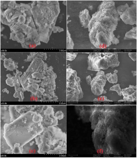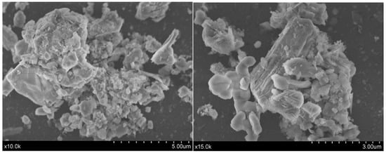 The SEM micrographs of SS are shown in Figure 4. Firstly, the particle size distribution shows that SS exclusively has a low grain size distribution of <5 µm according to the SEM scale. While some minerals, probably Quartz (SiO2) represent a relatively higher diameter. The morphology of SS was quite heterogeneous, displaying a rich mineralogical surface. In addition, SEM micrographs show pores of various sizes distributed over the surface of SS and oxides, confirming that the SS contains macro and mesopores as reported by BET analysis. These pores were predominantly large in diameter and volume, with low microporosity observed. Furthermore, it was clear that the surface of SS was quite rich in oxides, which display heterogeneous shapes and forms.