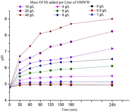Depending on disposal specifications, this experiment could determine the amount of SS needed to raise the OMWW to a given pH. For this reason, OMWW was treated with different dosages of SS. The variation of OMWW pH as a function of SS dosage is highlighted in Figure 5. It was obvious that the pH of OMWW increases parallelly with increasing time and SS mass. By considering neutral condition (pH = 7) as the appropriate pH value for OMWW disposal/treatment. The addition of 0.5, 1, 2, 4, 6, and 8 g(ss)/L(OMWW) increased the pH of OMWW gradually from 4.8 to 6.54 after 24 h of agitation. While a neutral pH of 7.18 was achieved only after 24 h of agitation by adding 10 g(ss) /L(OMWW) as the minimum required dose. For the remaining doses, 20 g/L and 40 g/L, neutral pH of 7.33 and 7.3 was reached rapidly after 120 and 60 min, respectively. It is to note that the maximum recorded pH was 9.02 after 24 h of agitation and 40 g(ss)/L(OMWW). The process of pH augmentation in OMWW could be explained by the dissociation of (Ca(OH)2) and (Mg(OH)2) hydroxides resulting from the hydrolysis of metal oxides such as CaO, MgO, and Al2O3. This dissociation results in the release of free cations and hydroxyl groups (OH-) in the solution, which raises the pH by neutralizing the OMWW’s organic acids. According to XRD and XRF characterization results, the studied SS was composed mainly of Hydrated lime (Ca(OH)2), dolomitic lime (Mg(OH)2), free lime CaO, and other alkaline metals. Lime is widely reported for its efficiency in OMWW treatment [,,,], e.g., Aktas et al. found that applying 40 g/L of lime for OMWW treatment raised the pH to 12 and removed 73% and 40% of polyphenols and COD, respectively []. Accordingly, SS could be considered a liming agent given its high content of dolomite (CaMg(CO3)2) and portlandite (Ca(OH)2). Similarly, Sarti et al. demonstrated the potential use of olive pomace biomass slag, which contains a similar composition as SS, to neutralize acidic agricultural sandy soils []. Therefore, regardless of the potential unexplored effects of OMWW treatment by SS. It could be deduced that the application of SS could at least neutralize OMWW and probably reduce COD and other polyphenolic compounds.