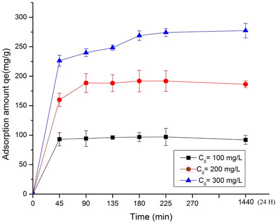 Effect of time on the adsorption of TA by SS (m = 100 mg; V = 100 mL; concentration = 100, 200 and 300 mg/L; pH = 5.8 ± 0.1; T = 293 ± 1 K; Agitation = 500 rpm).