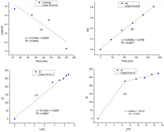 Kinetics curves for the TA adsorption by SS: (a–c) pseudo-first-order, pseudo-second-order and Elovich kinetics fitting, respectively, and (d) intraparticle diffusion model. Adsorption conditions: pH = 6.6; T = 293 K; time = 225 min.