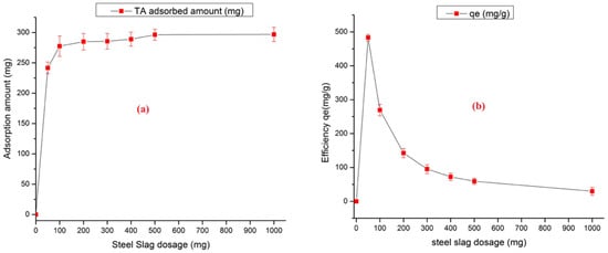 Effect of SS dosage on TA adsorbed amount (a) and efficiency of removal (b). Adsorption conditions: pH = 6.6; T = 293 K; time = 225 min; initial concentration = 300 mg/L, volume = 100 mL.