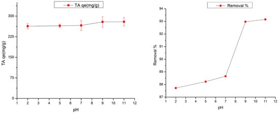 Effect of pH on TA adsorption. Adsorption conditions: SS dosage = 100 mg; T = 293 K; time = 225 min; initial concentration = 300 mg/L, volume = 100 mL.