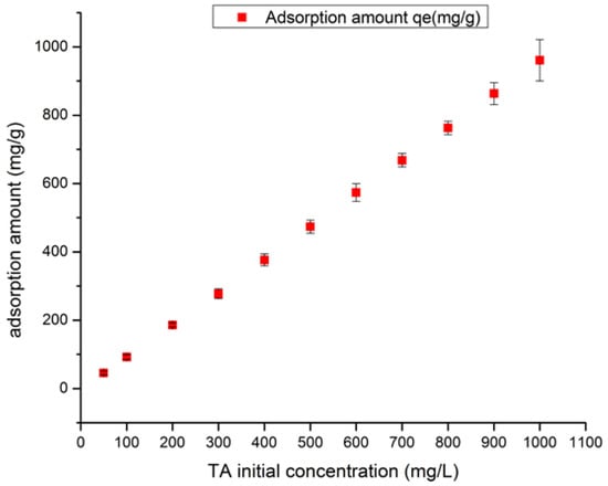 The adsorption of TA on SS at different initial concentrations (50–1000 mg/L) was investigated in this study. TA adsorption according to different equilibrium concentrations (Ce) is presented in Figure 10. An apparent linearity was observed regarding the removal of tannic acid, indicating a substantial removal of more than 90 % for each investigated initial TA concentration. These results demonstrate that the adsorption capacity increases with increasing TA initial concentration. The higher initial concentrations of TA could increase the driving force required to overcome the mass transfer barrier of phenols between the liquid and solid phases, resulting in a more significant possibility of contact between TA and sorbent [,].