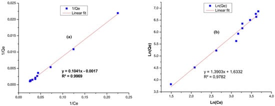 Currently, several theoretical models have been developed to describe adsorption isotherms, gathering information on surface adsorption, and types of interaction between Sorbent and Sorbate. Langmuir and Freundlich models listed below were used to model the experimental results in this study. The experimental data obtained from initial concentration were used to fit linear equation of Langmuir [] (Equation (10)) and Freundlich [] (Equation (11)) isotherms: