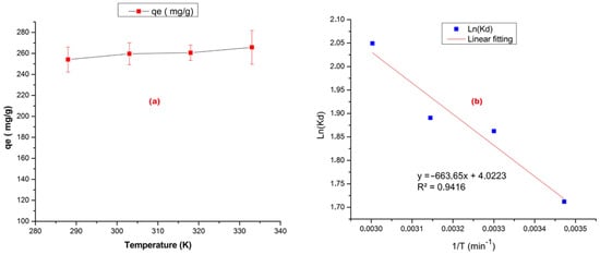 Effect of temperature on the adsorption of TA by steel slag (C0 = 300 mg/L; m = 100 mg; V = 100 mL; pH = 6.6 ± 0.1; time = 225 min; Agitation = 500 rpm) (a), adsorption thermodynamic for the TA adsorption by steel slag (b).