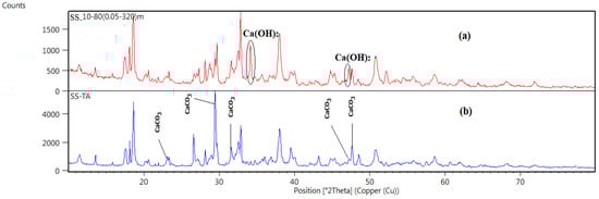 Murdiati et al. reported that the reaction between TA and Ca(OH)2 generates binded insoluble complexes []. Other authors added that complexation through chelation is possible between calcium and TA []. In comparison, other authors confirmed that the presence of Ca2+ in the solution greatly enhanced the adsorption of TA on polystyrene microplastics. In another study, Murdiati et al. studied the capacity of polyvinylpyrolidone (PVP), Ca(OH)2, and activated charcoal to precipitate TA in solution and found that Ca(OH)2 was more effective in the precipitation process of tannin and tannic acid []. This explains the fast adsorption of low TA concentration by SS, and may suggest that the formation of SS–TA complex depends on the initial TA concentration and the accessible free cations and hydroxyl groups in the solution. However, the adsorption of TA onto accessible mesopores should not be ignored.