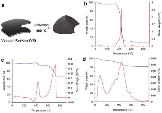 (a) Schematic representation of petroleum waste activation for porous activated carbon materials. Thermogravimetric curves of (b) VR-KOH, (c) VR-Ca(OH)2, and (d) VR-MgO (the heating rate at 10 °C min−1, under air).