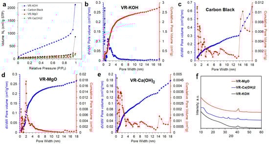(a) Comparative N2-adsorption isotherms classified as type I for VR-KOH, carbon black, VR-MgO, and VR-Ca(OH)2; pore-size distribution curves for (b) VR-KOH, (c) carbon black, (d) VR-MgO, and (e) VR-Ca(OH)2 determined using the NLDFT and (f) XRD pattern of VR-KOH, VR-MgO, and VR-Ca(OH)2.