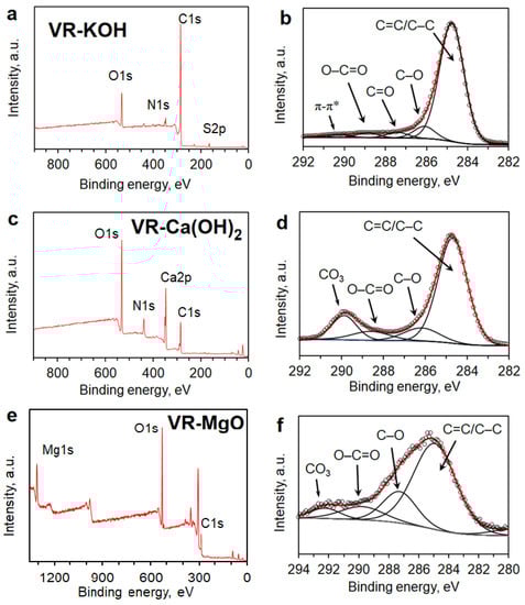 XPS survey spectra for (a) VR-KOH, (c) VR-Ca(OH)2, and (e) VR-MgO. XPS high-resolution C 1s spectra for (b) VR-KOH, (d) VR-Ca(OH)2, and (f) VR-MgO.