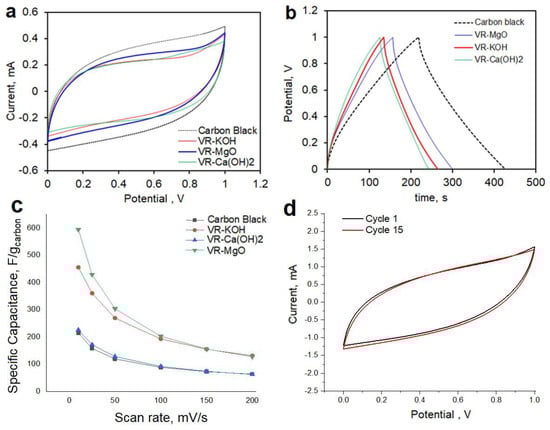 where I is the CV curve area, dv/dt is the scan rate, V is the potential range, and m is the mass of the active carbon materials. Supercapacitors require an accessible surface area; therefore, the high specific capacitance of 91.91 F/g was achieved for VR-KOH. On the other hand, carbon black with a specific surface area of 266 m2/g shows a specific capacitance of 48.21 F/g; see Figure 6 and Table 3. The rate performance data of different carbon electrodes in a 2-electrode cell configuration is shown in Figure 6c and was collected from CV performance at different scan rates. For all the samples, the trend shows a decreasing capacitance with increasing scan rates. The result is in agreement with Table 3, in which the performance of VR-Ca(OH)2 is comparable to the carbon black reference sample. Furthermore, VR-KOH and VR-MgO, two samples with a large difference in microporous areas, show a comparable specific capacitance, especially at higher scan rates. The potential range showed a minimum non-faradaic current according to a 3-electrode configuration test for each sample, which is indicative of the cyclability of the activated VR electrodes. Thus, it is not expected for any significant decay in capacity due to the electrochemical side reaction of the electrode and electrolyte. Nevertheless, capacity loss due to the mechanical detachment of the carbon powders is possible. Systematic investigation with XPS and SEM-EDX of the electrodes before and after cycling will give a better picture of the long-term electrochemical stability of the activated carbons. However, this is not the focus of our manuscript, which mainly highlights activating petroleum waste and its potential application. As an indication of the short-term cycle stability of VR-KOH, we provided cyclic voltammetry data of the VR-KOH electrode in a symmetric 2-electrode configuration showing similar current values for cycles 1 and 15 (Figure 6d).