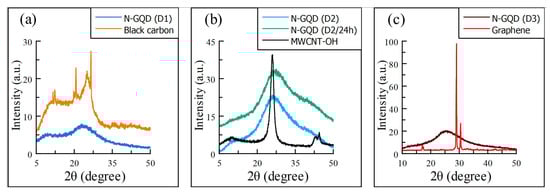 X-ray diffractograms of GQD synthesized using (a) black carbon, (b) MWCNT-OH, and (c) graphene carbon sources for pre and post hydrothermal treatmeant, showing a clearly amorphization of the precursor materials (the y-axis was modified to show better this effect). In addition, it is observed a very similar diffractogram (b) for the Sample D2 and its variation D2/24 h.