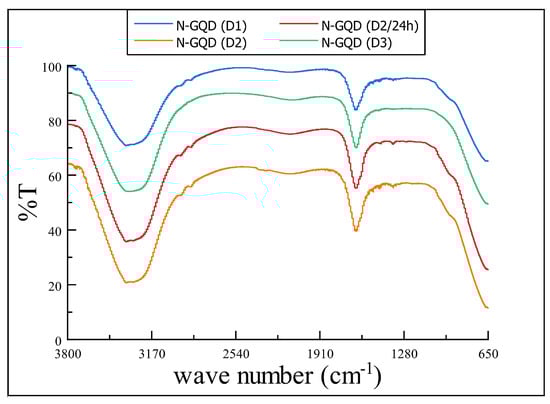 IR spectra for samples of N-GQD obtained using blank carbon (D1), MWCNT-OH (D2 and D2/24 h) and graphene (D3) after the hydrothermal treatment. Additionally, D2 Samples seems to be quite similar in every signal vibration (the y-axis values were modified to differentiate the spectra for each sample).