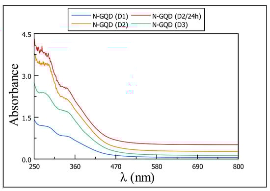 UV-Vis spectra for samples of N-GQD obtained using black carbon (D1), MWCNT-OH (D2 and D2/24 h) and graphene (D3) after hydrothermal treatment. Samples of D2 keep following very similar results (y-axis values were modified to differentiate the signals for each sample).