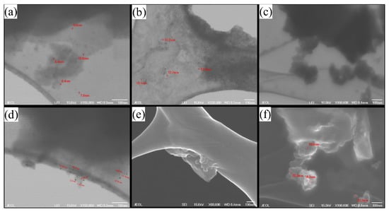FE-SEM images before hydrothermal treatment for (a,c,d,f) 360 min and (b,e) 1440 min. Images (f,e) are generated by the backscattered electron modality. (a,d) images are for experiment D1, showing some agglomerated particles with size around of 8–10 nm; (b) for experiment D2, showing some agglomerated particles with size around of 11–13 nm; (e) for experiment D2/24 h; (c,f) for experiment D4, showing agglomerated particles with size around of 18–21 nm.