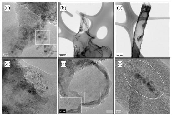 TEM analysis shows more accurate particle size information. The common observation for all samples is the way the hydrothermal treatment affects the precursor material; it’s observable that in their layers, there are small circular particles with different linear patterns (0.21 nm bond distance, carbon distance) to those of the rest of the precursor material. The small particles sizes are between 4 and 7 nm. Black carbon material (Figure 5a,d) again shows better size distribution of small particles; MWCNT-OH (Figure 5b,c,e,f) in the analysis, it can be seen how tubes are opened because of the oxidative cleavage, forming a single layer of carbon or simply ‘braking’ the tube (Figure 5c). In addition, the results observable for experiment D1 are very similar to Lu et al. (2017) [16].
