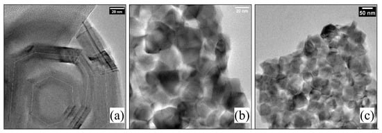 TEM images for experiment D3. White line in (a) follow an hexagonal structure, it is observable the small particle size agglomeration. For (b,c) images it is observable the characteristic hexagonal shape of graphene-like structures, these hexagonal particles with a size between 20–50 nm are agglomerated.