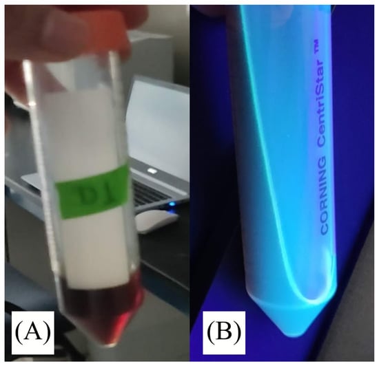 (B) figure show evidence of fluorescence in the sample obtained by hydrothermal treatment. The same solution color, figure (A), at daylight it’s brown-reddish.