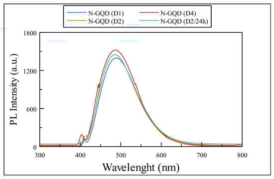 The results for photoluminiscense spectroscopy show a maximum emission peak at 496 nm, 490, nm and 488 nm for Samples D1, D2, D2/24 h, and D3 (the last two share the same maximum fluorescence wavelength) in Figure 8. Photoluminescence effect in N-GQDs is originated by the quantum confinement effect and the resonance of the double bonds; it can be affected by the particle size; and in the case of Sample D3, it’s observable the shifting of the maximum emission peak in contrast to the rest of the samples when presenting different particle sizes (as mentioned in the TEM analysis).