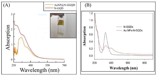Result obtained from the coupling reaction of to N-GQDs (A) to form the AuNP@N-GQD nanocomposite; inserted: photograph of N-GQD@AuNP solution, contrasted against the work of Ju et al. (2015) [11] (B).