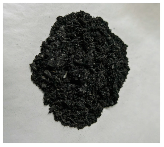 In this study, activated carbon (AC) was selected as the feedstock in the microwave chamber. The AC was bought from Henan Lize Environmental Protection Technology Co., Ltd. (Zhengzhou, China), which was derived from the corn stalk, pyrolyzed in the absence of oxygen, with the temperature ranging from 500 °C to 600 °C. The AC sample is shown in Figure 1.