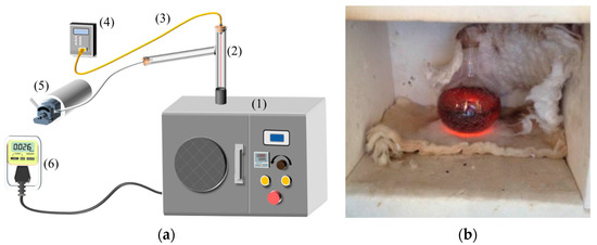 Microwave assisted heating system. (1) microwave chamber; (2) connection pip; (3) K-type thermocouple; (4) temperature indicator; (5) vacuum pump; (6) electric power detector. (a) Systematic diagram; (b) Quartz chamber.
