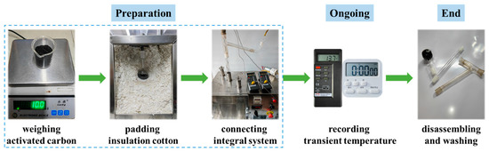 To explore the heating performance of AC in the microwave chamber, the experiment was organized as shown in Figure 3: (1) weigh the feedstock for 10 g precisely and then put it into the reactor whose volume was 150 mL; (2) place the reactor in the microwave oven, pad the insulated cotton inside the microwave oven, and measure the displayed temperature; (3) connect the integral experimental system as depicted in Figure 2, and then switch the vacuum pump to remove the remained gas; (4) switch the microwave oven at the power of 500 W, and record the temperature per five seconds until around 200 °C was reached; (5) experiment was completed and all connection pipes were washed for the subsequent experiment. Each experiment was repeated three times.