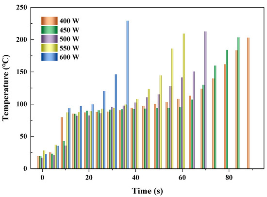 The obvious flat level of temperature was observed at low microwave power (400 W) when the heating time ranged from 15 to 65 s. With the power increased, the time interval of flat level contracted gradually until the shortest interval sustained for around 10 s at 600 W. The time intervals were 50, 45, 25, 20, and 10 s, respectively. Generally, the heating rates rose with the increased microwave powers, resulting in the flat level disappearing gradually.