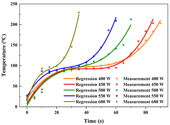 Figure 5 shows the predicted and experimental temperatures at different microwave powers. The R2 of fitting results were 97.3, 97.2, 96.3, 97.3, and 94.8% for the microwave powers of 400, 450, 500, 550, and 600 W, respectively, as shown in Table 2. To further evaluate the accuracy of the fitting formulae for predicting the temperature of AC in the heating process by virtue of using heating time, the relative errors between predicted and experimental temperatures were calculated. The variation of temperature of AC was not stabilized at the initial heating period, which resulted from the prominent influence of the ambient environment. The relative errors between predicted and experimental temperatures were relatively noticeable at the first 10 s. The maximum relative errors reached 72.4, 58.8, −79.9, 44.3, and 66.7%, corresponding to the microwave powers of 400, 450, 500, 550, and 600 W, respectively. After the initial 10 s, the prediction of heating temperature showed a relative accurate prediction. The relative errors ranged from −12.6 to 6.6, −14.5 to 7.9, −15.4 to 12.4, −6.1 to 3.9, and −5.6 to 6.9%, with the microwave powers at 400, 450, 500, 550, and 600 W, respectively. The maximum relative error predicted (−79.9%) for different microwave powers was generally higher than the predicted value (35.51%) for heating plastic waste reported by Fu et al. [54]. This resulted from the dramatic fluctuation of the temperature at the initial heating period.