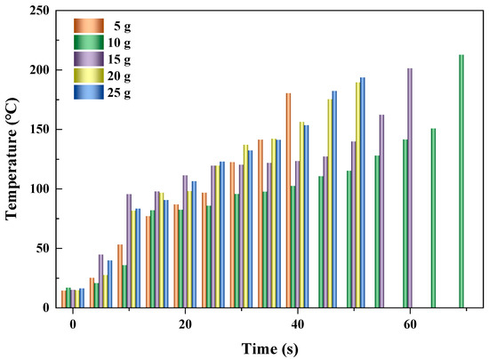 Figure 6 shows the heating performances of AC at different feeding loads (5, 10, 15, 20, and 25 g) when the microwave power and reactor volume were fixed at 500 W and 150 mL, respectively. It showed that as time went on, the temperature of AC improved monotonously with the increase in time, resulting from more microwave energy absorbed by the AC particles with increased heating time. Normally, when more AC was fed, a shorter time was needed for the desired temperature (about 200 °C). It was obviously observed that the times for the temperature of AC reaching the desired value were 70, 60, and 50 s when the feeding loads were 10, 15, and 20 g, with average heating rates of 2.8, 3.1, and 3.5 °C/s, respectively, as shown in Table 3. This was because the increased feeding load at fixed microwave power and reactor volume led to decreased radiating surface per unit mass, with more heat stored for improving the temperature of AC [38]. At the condition when the feeding load was 25 g, the temperature of AC reached a desired value after 50 s, being the same as that of 20 g. The more accurate heating rate for the feeding load of 20 g was 3.50 °C/s, whereas that of 25 g was 3.55 °C/s, indicating the heating rate of AC became slow when the feeding load ranged from 20 g to 25 g. Another noticeable phenomenon was that when the AC was fed at 5 g, the feeding rate was 4.2 °C/s, obviously being higher than those at the other conditions. This was mainly because hot spots were generated inside by the micro-plasma [2]. The flat level existed at the conditions in which the feeding loads were 10, 15, and 20 g, with time intervals of 20, 15, and 5 s, respectively. When the feeding load was 25 g, the flat level disappeared due to the high heating rate caused by less heat loss, while with respect to the feeding load of 5 g, no obvious flat level was observed due to the high heating rate resulting from the hot spot. Generally, as the heating rate rose, the flat level disappeared gradually at different feeding loads.