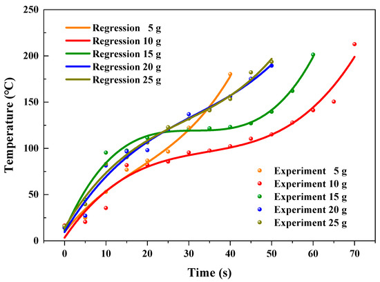 Figure 7 shows the predicted and experimental temperatures at different feeding loads. The R2 of fitting results were 99.1, 96.3, 98.9, 98.2, and 99.1% for the feeding loads of 5, 10, 15, 20, and 25 g, respectively, as shown in Table 3.