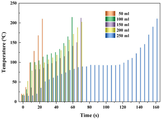 Figure 8 shows the heating performances of AC at different reactor volumes (50, 100, 150, 200, and 250 mL) when the microwave power and feeding load were fixed at 500 W and 10 g, respectively. It shows that as time went on, the temperature of AC improved monotonously with the increase in time. This was because more microwave energy was absorbed by the AC particles with increased heating time. Larger reactor volume was provided, and longer time was needed for the desired temperature (about 200 °C). The times that the temperature of AC reached the desired value were 25, 60, 70, 70, and 160 s when the reactor volumes were 50, 100, 150, 200, and 250 mL, with average heating rates of 7.6, 3.3, 2.8, 2.6, and 1.2 °C/s, respectively, as shown in Table 4. The highest heating rate of AC occurred at the reactor volume of 50 mL, and the lowest occurred at the reactor volume of 250 mL. The variation of temperature for heating AC presented an identical tendency as reported by Hong et al. [49]. This was due to the increased reactor volume at fixed microwave power and feeding load leading to increased radiating surface per unit mass, with less heat stored for improving the temperature of AC. At the conditions of various reactor volumes, the flat lever existed obviously at reactor volume of 250 mL, with a time interval of 55 s. With respect to the other conditions, the flat level was relatively insignificant.
