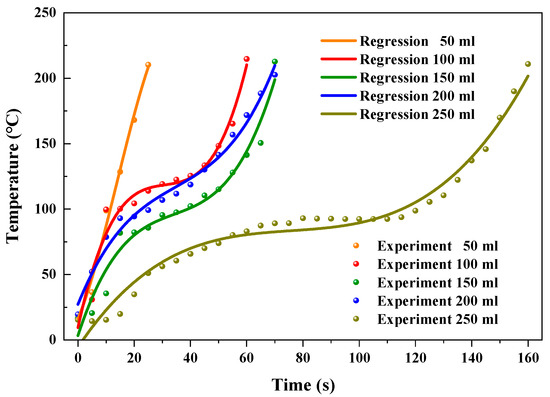 Figure 9 shows the predicted and experimental temperatures at different reactor volumes. The R2 of fitting results were 98.9, 96.9, 96.3, 98.7, and 97.5% for the reactor volumes of 50, 100, 150, 200, and 250 mL, respectively, as shown in Table 4.