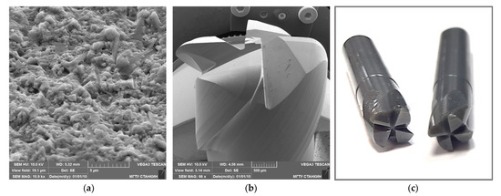 Figure 1a shows the SEM image of the microstructure of samples of sintered SiAlON ceramics obtained on a Tescan VEGA 3 LMH scanning electron microscope (Brno, Czech Republic). Samples in the form of washers of 19 mm in diameter and 7 mm in height were made from sintered ceramic blanks, which were subsequently coated with (CrAlSi)N/DLC-Si compositions for various types of analysis and tribological tests. In addition, samples of end mills with a diameter of 10 mm and a length of 60 mm were made from sintered ceramic blanks. An SEM image of its cutting part is shown in Figure 1b. A photograph of their general view is presented in Figure 1c. The technology of diamond sharpening of end mills is described in detail in [35]. (CrAlSi)N/DLC-Si coatings were deposited on the end mills, which showed the best performance in high-temperature tribological tests.