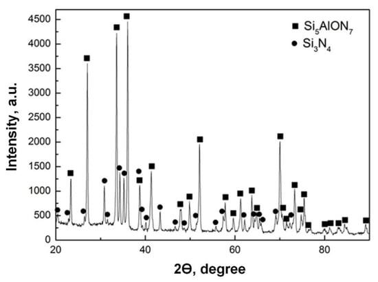 The X-ray diffraction pattern of a sintered sample made of SiAlON ceramics used in the research is shown in Figure 2. X-ray phase analysis was carried out on a Bruker D8 Advance diffractometer (Bruker AXS GmbH, Karlsruhe, Germany) with monochromatic CuKα radiation when shooting in the angle range of 20–90° 2Θ with a step of 0.05° and exposure to each point for 5 s. The analysis of the obtained results using the ICDD PDF-2 database made it possible to reveal the main structural components of the sintered SiAlON ceramics, which is represented by the Si5AlON7 and Si3N4 phases.