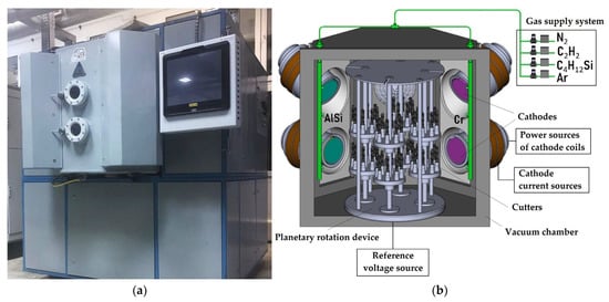 The general view and internal design of the processing unit used for the deposition of CrAlSi)N/DLC-Si coatings are shown in Figure 3. The volume content of tetramethylsilane in the gas mixture was varied in the volume of 1, 4, 7, and 10% to provide different content of the alloying element (silicon) in DLC-Si composition. The total thickness of the deposited coatings was controlled by the deposition time and amounted to ~3.9 µm including ~1.9 µm for (CrAlSi)N and ~2.0 µm for DLC. A block diagram of the technological process and the sequence of operations with the modes of (CrAlSi)N/DLC-Si coating deposition on samples made of SiAlON ceramics is shown in Figure A1 (Appendix A).