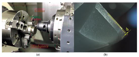 Figure 4. Positioning of end mills made of SiAlON ceramics relative to the workpiece made of NiCr20TiAl alloy for wear resistance testing (a) and the wear center location on the back surface of the cutting tooth and measuring hf in quantifying wear (b).