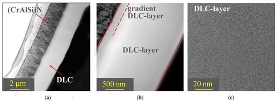Figure 5. TEM images of the cross-section of the (CrAlSi)N/DLC-Si coating (a,b) and the DLC-Si outer layer (c).