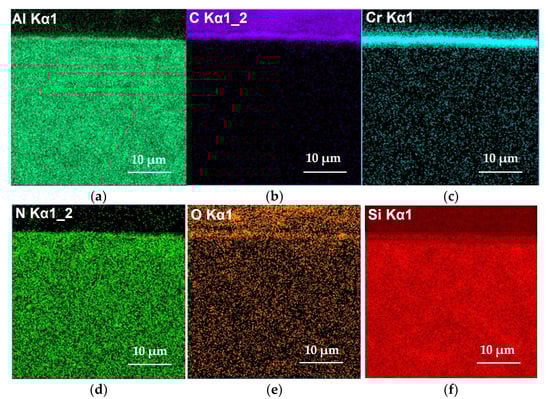 Figure 7. EDX-maps of the chemical elements’ distribution in the surface layer of a sample made of SiAlON ceramics with (CrAlSi)N/DLC-Si coatings: (a) aluminum; (b) carbon; (c) chromium; (d) nitrogen; (e) oxygen; (f) silicon.