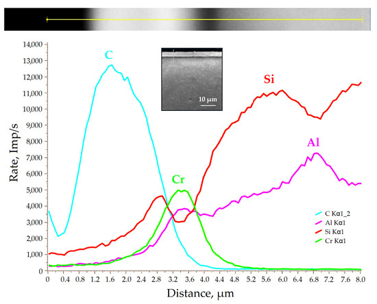 Figure 8 shows the distribution of elements over the cross-section of a (CrAlSi)N/DLC-Si coating formed on a sample of SiAlON tool ceramics. It is seen that the silicon concentration increases upon transition from the main DLC layer to the gradient DLC layer (the layer structure is visible in Figure 5b), then it slightly decreases along the depth of the intermediate (CrAlSi)N layer and sharply increases along the depth of the SiAlON ceramics.
