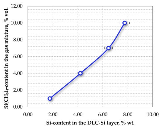 Figure 9 shows the relationship between the content of tetramethylsilane in the gas mixture used during the primary (outer) DLC-Si layer deposition and the silicon content in it, revealed by the results of XPS analysis. It can be seen that the dependence is linear, and the content of the mass fraction of Si (% wt.) increases monotonically with an increase in the Si(CH3)4 content in the gas mixture (% vol.). Thus, the presence of 1, 4, 7, and 10% vol. Si(CH3)4 in the gas mixture ensures the Si content in the DLC-Si layer is about 1.5, 4.1, 6.2, and 7.7% wt.