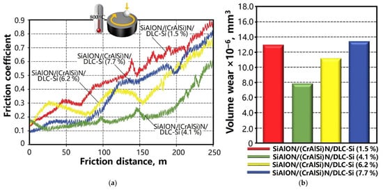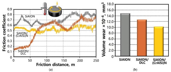 Figure 10. Change in the coefficient of friction depending on the testing time of samples made of SiAlON ceramics with (CrAlSi)N/DLC-Si coatings (a) and volumetric wear of samples after passing a distance of 250 m at high-temperature friction-sliding (b).