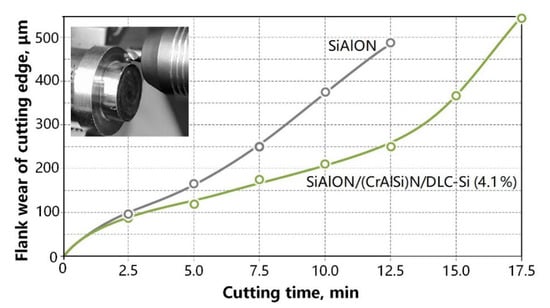 Thus, the average operating time (wear resistance) of coated end mills before reaching the accepted failure criterion was 15.5 min and 10.5 min for the original cutters. Considering the extremely high cost of ceramic end mills, the achieved result of increasing wear resistance through the formation of (CrAlSi)N/DLC-Si coatings can provide a significant economic benefit.