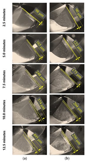 Figure 13. Optical images of the development of wear areas on the tooth flanks of uncoated (a) and (CrAlSi)N/DLC-Si-coated (b) SiAlON-ceramic end mills with an increase in cutting time.